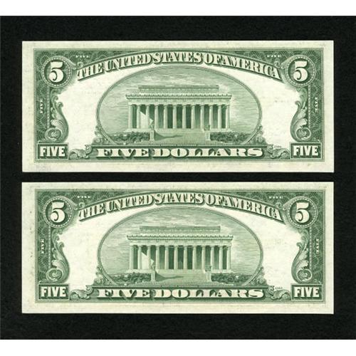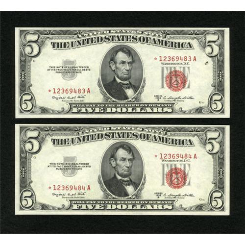 <B>Fr. 1534* $5 1953B Legal Tender Notes. Two Consecutive Examples. Crisp Uncirculated.</B></I><BR> A light teller pinch is noticed on these strongly embossed beauties with fresh crimson overprints.<BR><BR><b>Shipping:</b> Coins & Currency (<a target="_blank" href="http://www.heritageauctions.com/common/shipping.php">view shipping information</a>)