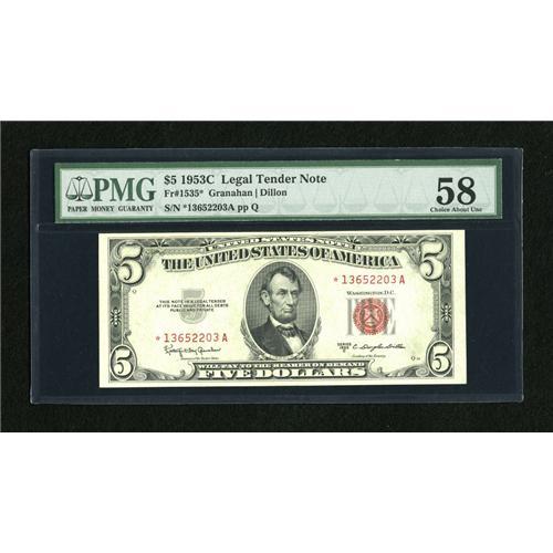 <B>Fr. 1535* $5 1953C Legal Tender Note. PMG Choice About Unc 58.</B></I><BR>A corner bump accounts for the grade on this attractive issue.<BR><BR><b>Shipping:</b> Coins & Currency (<a target="_blank" href="http://www.heritageauctions.com/common/shipping.php">view shipping information</a>)