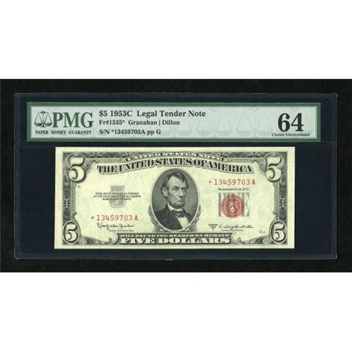 <B>Fr. 1535* $5 1953C Legal Tender Star Note. PMG Choice Uncirculated 64.</B></I><BR> A well margined and bright replacement note.<BR><BR><b>Shipping:</b> Coins & Currency (<a target="_blank" href="http://www.heritageauctions.com/common/shipping.php">view shipping information</a>)