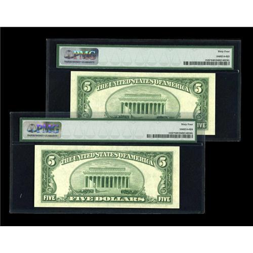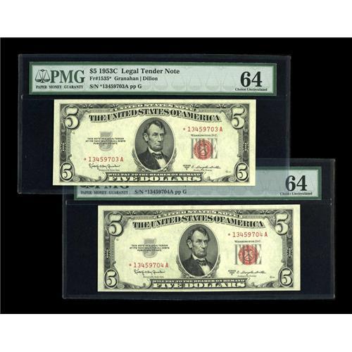 <B>Fr. 1535* $5 1953C Legal Tender Notes. Two Consecutive Examples. PMG Choice Uncirculated 64.</B></I><BR>These stars show Treasury seal embossing.<BR><BR><b>Shipping:</b> Coins & Currency (<a target="_blank" href="http://www.heritageauctions.com/common/shipping.php">view shipping information</a>)