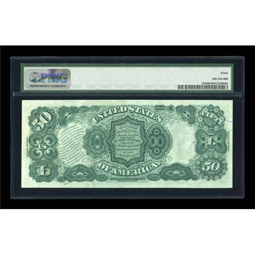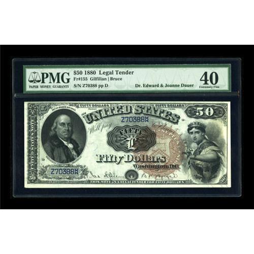 <B>Fr. 155 $50 1880 Legal Tender PMG Extremely Fine 40.</B></I> An extreme rarity and one of only nine examples known for this number. This is the only piece that PMG has graded. PCGS has graded an AU, which we sold for $46,000 at this same venue last September. This note has been used by the Dauers to illustrate the type at the top of page 114 of their book. As the note is identical in appearance to the far-more-common Fr. 161, the price of this extremely rare piece is held down a bit. Were it a distinct design type, a note with nine known examples would be a solid six-figure item. As this is a signature variety, the result will stay well clear of the six-figure mark, but this handsome extreme rarity should easily realize...<BR><I>From The Dr. Edward & Joanne Dauer Collection</B></I><BR><BR><b>Shipping:</b> Coins & Currency (<a target="_blank" href="http://www.heritageauctions.com/common/shipping.php">view shipping information</a>)