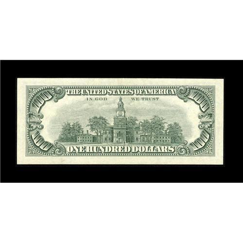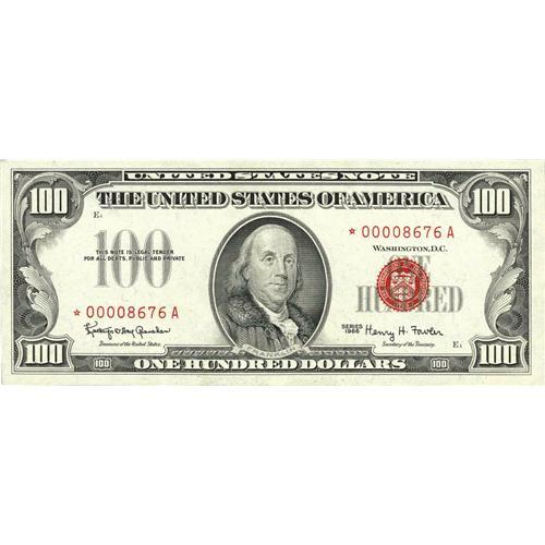 <B>Fr. 1550* $100 1966 Legal Tender Note. About Uncirculated.</B></I><BR>Wide margins and a dark red overprint are displayed by this lightly handled star. The back reveals a trace of blue ink. Still a scarce and popular star note.