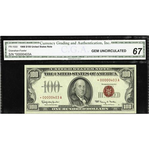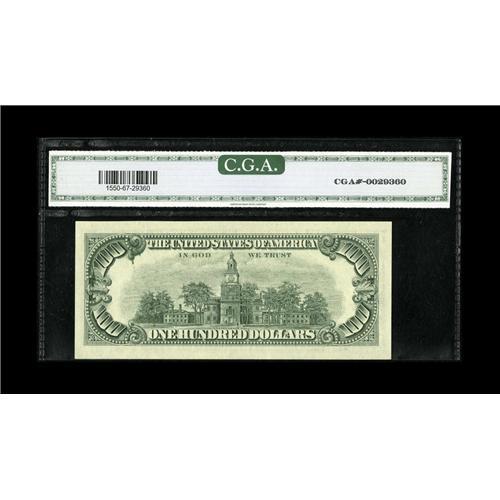 <B>Fr. 1550* $100 1966 Legal Tender Note. CGA Gem Uncirculated 67.</B></I><BR>An attractive example of a stunning replacement note with bright overprints and pleasing margins.
