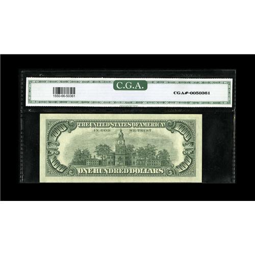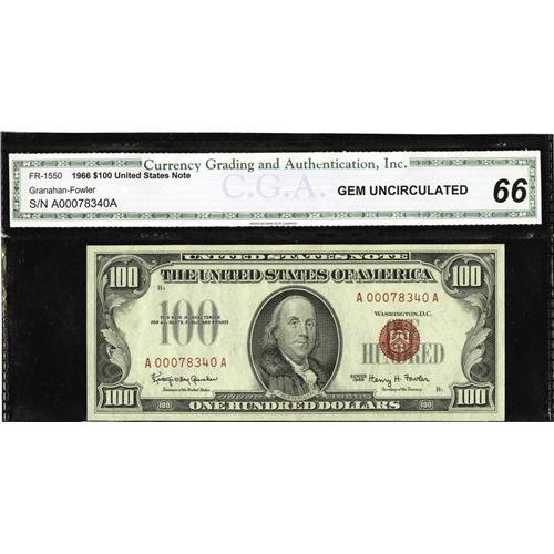 <B>Fr. 1550 $100 1966 Legal Tender Note. CGA Gem Uncirculated 66.</B></I><BR>Nice centering highlights this red seal which displays bold color and plenty of embossing.