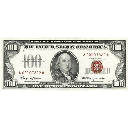 <B>Fr. 1550 $100 1966 Legal Tender Note. Choice Crisp Uncirculated.</B></I><BR>Broad margins encircle this Red Seal Hundred that carries a couple of pinholes.