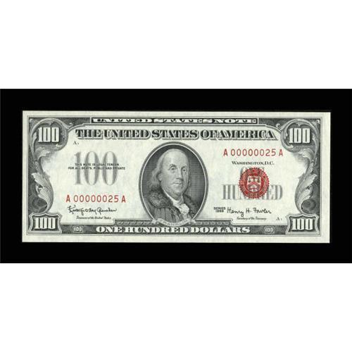 <B>Fr. 1550 $100 1966 Legal Tender Note. Low Serial Number 25. Very Choice Crisp Uncirculated.</B></I><BR> The last time we saw an example from this special run was serial number 29 that we offered back in 2004. This note remains a beautiful low numbered example with the two-digit serial number A00000025A. This Red Seal Hundred is perfectly natural with crackling fresh paper quality and excellent eye appeal. A small corner bump removes it from the Gem category. Originally part of the Amon Carter holdings, this piece would enhance any small size type collection. <BR><BR><b>Shipping:</b> Coins & Currency (<a target="_blank" href="http://www.heritageauctions.com/common/shipping.php">view shipping information</a>)