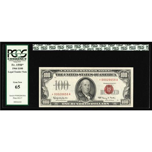 <B>Fr. 1550* $100 1966 Legal Tender Note. PCGS Gem New 65.</B></I><BR>A bright and nearly flawless Gem in a PCGS 65 holder.