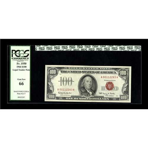 Fr. 1550 $100 1966 Legal Tender Note. PCGS Gem New 66.A