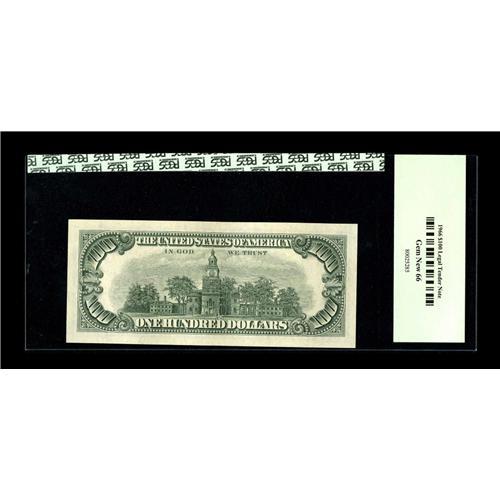 <B>Fr. 1550 $100 1966 Legal Tender Note. PCGS Gem New 66.</B></I><BR>Another eye appealing example with behemoth margins.<BR><BR><b>Shipping:</b> Coins & Currency (<a target="_blank" href="http://www.heritageauctions.com/common/shipping.php">view shipping information</a>)