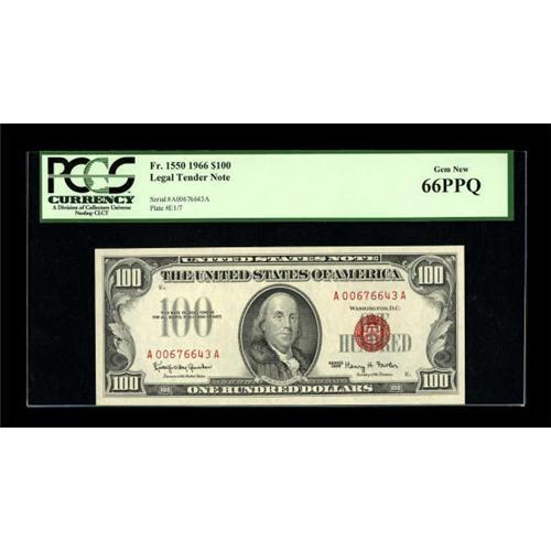 <B>Fr. 1550 $100 1966 Legal Tender Note. PCGS Gem New 66PPQ.</B></I><BR> This is a vibrant example with large margins.<BR><BR><b>Shipping:</b> Coins & Currency (<a target="_blank" href="http://www.heritageauctions.com/common/shipping.php">view shipping information</a>)