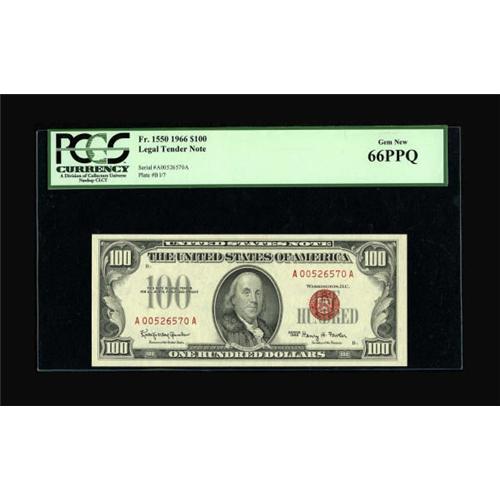 <B>Fr. 1550 $100 1966 Legal Tender Note. PCGS Gem New 66PPQ.</B></I><BR> Behemoth margins are noticed on this blazing red seal.<BR><I>From The Drew Keough Collection</B></I><BR><BR><b>Shipping:</b> Coins & Currency (<a target="_blank" href="http://www.heritageauctions.com/common/shipping.php">view shipping information</a>)