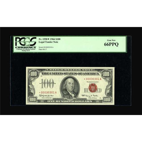 <B>Fr. 1550* $100 1966 Legal Tender Note. PCGS Gem New 66PPQ.</B></I><BR> A bold overprint creates much eye appeal on this popular replacement note.<BR><I>From The Drew Keough Collection</B></I><BR><BR><b>Shipping:</b> Coins & Currency (<a target="_blank" href="http://www.heritageauctions.com/common/shipping.php">view shipping information</a>)