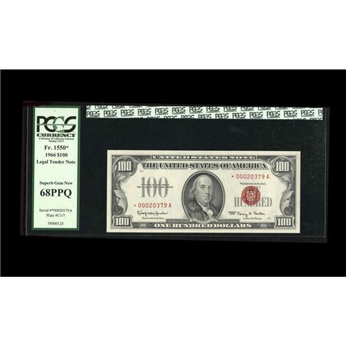 <B>Fr. 1550* $100 1966 Legal Tender Note. PCGS Superb Gem New 68 PPQ.</B></I><BR>A second example which is just as pristine and perfectly centered as the note above. It is again encapsulated in a PCGS Superb Gem New 68 PPQ holder. We may be conservative in our estimate here, as notes of this quality and rarity are seldom available at any price.