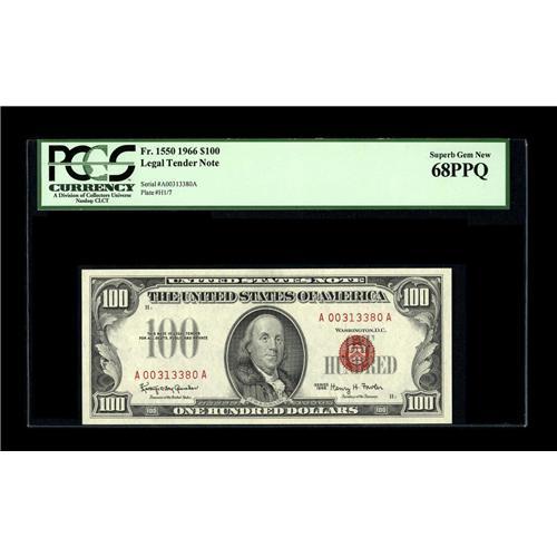 <B>Fr. 1550 $100 1966 Legal Tender Note. PCGS Superb Gem New 68PPQ.</B></I><BR>A little less than a year ago we featured a $100 Legal Star in PCGS 68PPQ. That piece sold for a strong price of $5,175. This piece is the first regular issue we've handled in this grade and we expect it to draw similar interest.<BR><BR><b>Shipping:</b> Coin/Currency (<a target="_blank" href="http://www.heritageauctions.com/common/shipping.php">view shipping information</a>)