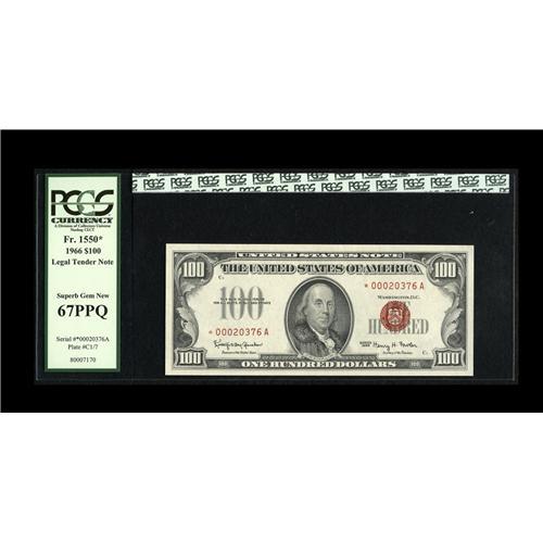 <B>Fr. 1550* $100 1966 Legal Tender Note. PCGS Superb Gem New 67PPQ.</B></I><BR>Bold margins and a perfectly executed design are noted.<BR><BR><b>Shipping:</b> Coin/Currency (<a target="_blank" href="http://www.heritageauctions.com/common/shipping.php">view shipping information</a>)