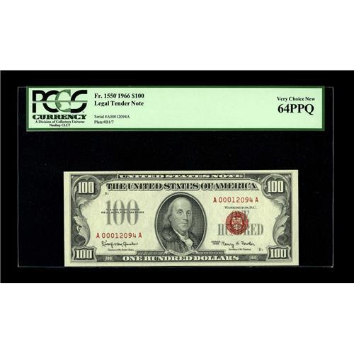<B>Fr. 1550 $100 1966 Legal Tender Note. PCGS Very Choice New 64PPQ.</B></I><BR>Tightness is noticed across the top on this bright Legal Tender.<BR><I>From The Bill and Kathy Stella Currency Collection</B></I><BR><BR><b>Shipping:</b> Coin/Currency (<a target="_blank" href="http://www.heritageauctions.com/common/shipping.php">view shipping information</a>)