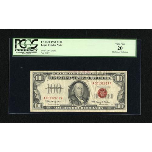 <B>Fr. 1550 $100 1966 Legal Tender Note. PCGS Very Fine 20.</B></I><BR> This bright note appears crisp despite the wrinkles visible.<BR><BR><b>Shipping:</b> Coins & Currency (<a target="_blank" href="http://www.heritageauctions.com/common/shipping.php">view shipping information</a>)