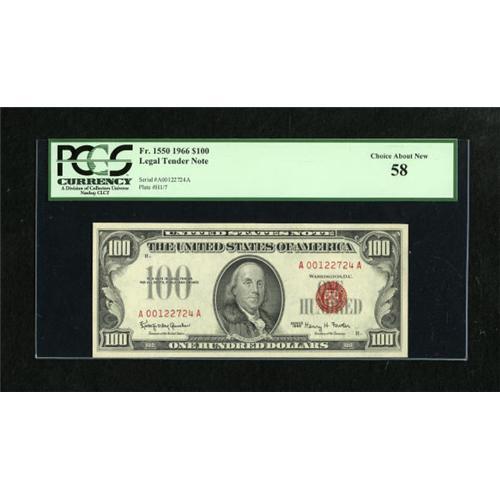 <B>Fr. 1550 $100 1966 Legal Tender Note. PCGS Choice About New 58.</B></I><BR> A lovely example of this red seal hundred that looks like a wonderful Gem note to this cataloger. There is presumably a hidden fold or handling but if there is it is not visible through the holder.<BR><BR><b>Shipping:</b> Coins & Currency (<a target="_blank" href="http://www.heritageauctions.com/common/shipping.php">view shipping information</a>)
