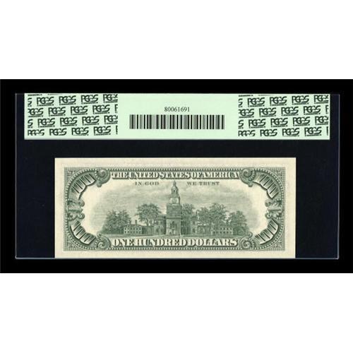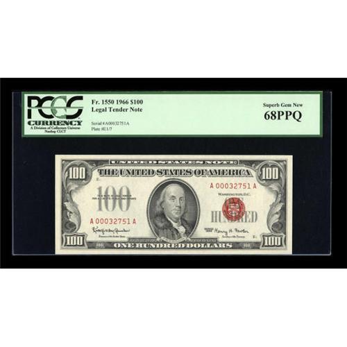 <B>Fr. 1550 $100 1966 Legal Tender Note. PCGS Superb Gem New 68PPQ.</B></I><BR> A few years ago, an original pack of $100 Legal Tenders surfaced that produced a number of high grade pieces, including a number of 68PPQs and a 69PPQ. The regular issue is another story entirely. To date, we have handled only one other 68PPQ. This piece is as deserving as any ultra superb piece with perfectly even margins and sharp embossing.<BR><BR><b>Shipping:</b> Coins & Currency (<a target="_blank" href="http://www.heritageauctions.com/common/shipping.php">view shipping information</a>)