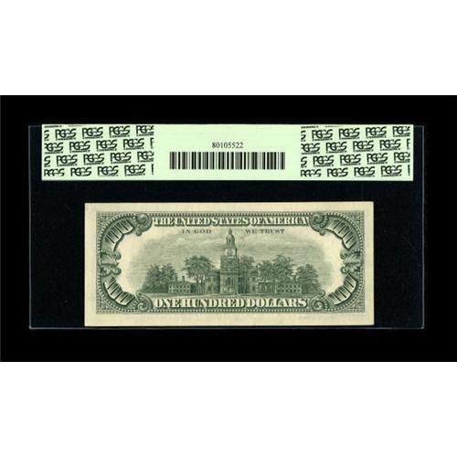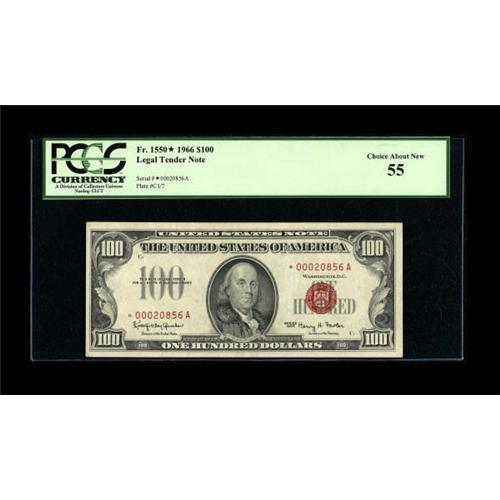 <B>Fr. 1550* $100 1966 Legal Tender Note. PCGS Choice About New 55.</B></I><BR> Some embossing remnants are visible on this vivid, deeply inked replacement.<BR><BR><b>Shipping:</b> Coins & Currency (<a target="_blank" href="http://www.heritageauctions.com/common/shipping.php">view shipping information</a>)