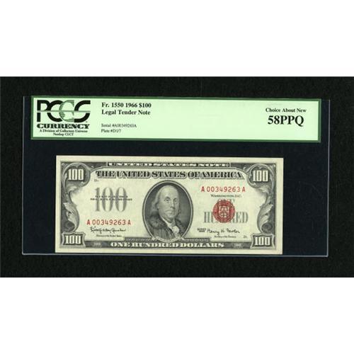 <B>Fr. 1550 $100 1966 Legal Tender Note. PCGS Choice About New 58PPQ.</B></I><BR> Bold embossing is noted on this piece which is second in a consecutive pair.<BR><BR><b>Shipping:</b> Coins & Currency (<a target="_blank" href="http://www.heritageauctions.com/common/shipping.php">view shipping information</a>)