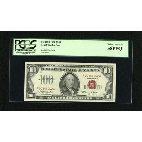<B>Fr. 1550 $100 1966 Legal Tender Note. PCGS Choice About New 58PPQ.</B></I><BR> The second piece of a wholly original consecutive pair.<BR><BR><b>Shipping:</b> Coins & Currency (<a target="_blank" href="http://www.heritageauctions.com/common/shipping.php">view shipping information</a>)
