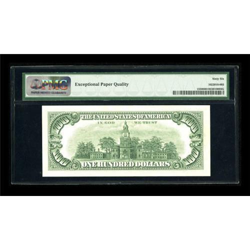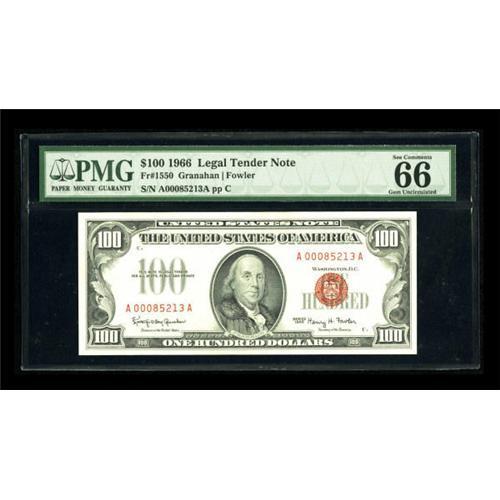 <B>Fr. 1550 $100 1966 Legal Tender Note. PMG Gem Uncirculated 66 EPQ.</B></I><BR> A cherry red overprint is noted on this solidly margined Gem.<BR><BR><b>Shipping:</b> Coins & Currency (<a target="_blank" href="http://www.heritageauctions.com/common/shipping.php">view shipping information</a>)
