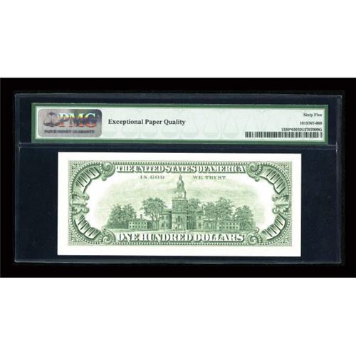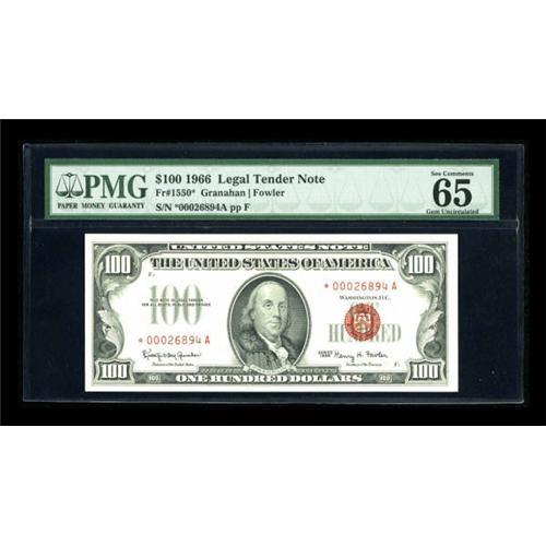 <B>Fr. 1550* $100 1966 Legal Tender Note. PMG Gem Uncirculated 65 EPQ.</B></I><BR> Broad margins are noted on this bright star.<BR><BR><b>Shipping:</b> Coins & Currency (<a target="_blank" href="http://www.heritageauctions.com/common/shipping.php">view shipping information</a>)