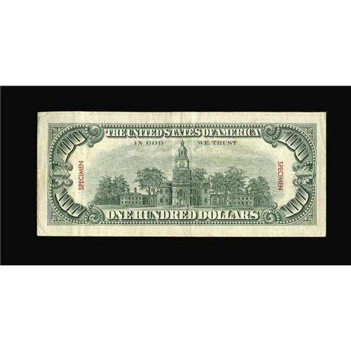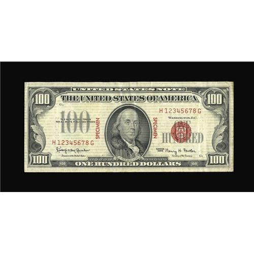 <B>Fr. 1550 $100 1966 Legal Tender Note. Very Fine-Extremely Fine.</B></I><BR>From our January 2006 FUN auction where the description read, "Bold red vertical stamps on both sides of Franklin and at each end of the back denote this C-note as a Specimen as does the serial number H12345678G. While Federal Reserve Note Specimens are seen with some regularity, this note is a rare sight indeed, we have not seen another example of a $100 Legal Tender Specimen in our many years of work."<BR><BR><b>Shipping:</b> Coins & Currency (<a target="_blank" href="http://www.heritageauctions.com/common/shipping.php">view shipping information</a>)