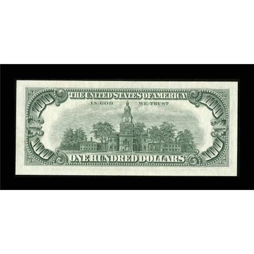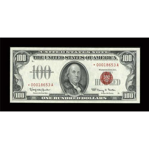<B>Fr. 1550* $100 1966 Legal Tender Note. Very Choice Crisp Uncirculated.</B></I><BR> A teller counting mark is noticed at left on this well embossed note with vibrant inks.<BR><BR><b>Shipping:</b> Coins & Currency (<a target="_blank" href="http://www.heritageauctions.com/common/shipping.php">view shipping information</a>)