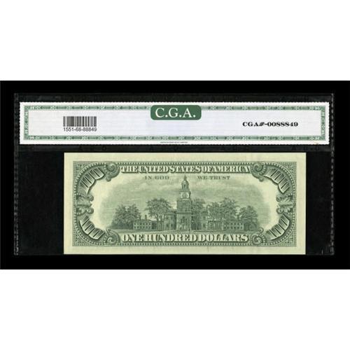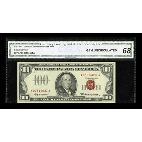 <B>Fr. 1551 $100 1966A Legal Tender Note. CGA Gem Uncirculated 68.</B></I><BR> Pleasing, even margins surround this red seal, which is considerably scarcer than its Series 1966 sibling.<BR><BR><b>Shipping:</b> Coins & Currency (<a target="_blank" href="http://www.heritageauctions.com/common/shipping.php">view shipping information</a>)