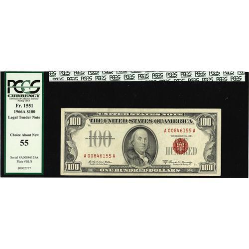 <B>Fr. 1551 $100 1966A Legal Tender Note. PCGS Choice About New 55.</B></I><BR>This example sports embossing viewable through the third-party holder.
