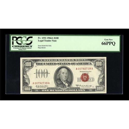 <B>Fr. 1551 $100 1966A Legal Tender Note. PCGS Gem New 66PPQ.</B></I><BR> A pleasing nicely margined note from the tougher of the two series.<BR><I>From The Drew Keough Collection</B></I><BR><BR><b>Shipping:</b> Coins & Currency (<a target="_blank" href="http://www.heritageauctions.com/common/shipping.php">view shipping information</a>)
