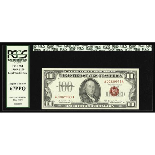 <B>Fr. 1551 $100 1966A Legal Tender Note. PCGS Superb Gem New 67 PPQ.</B></I><BR>A perfectly centered PCGS certified example of this latter day rarity which bears the desired PPQ designation as well. This just as easily could have been graded 68 as the centering and appearance of this note are well nigh perfect.