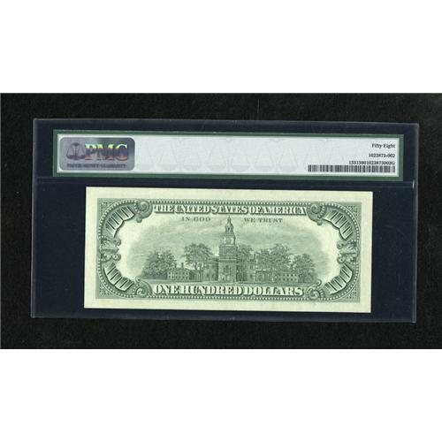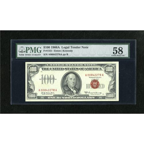 <B>Fr. 1551 $100 1966A Legal Tender Note. PMG Choice About Unc 58.</B></I><BR>A well printed example of this tougher issue which is nicely margined.<BR><BR><b>Shipping:</b> Coins & Currency (<a target="_blank" href="http://www.heritageauctions.com/common/shipping.php">view shipping information</a>)