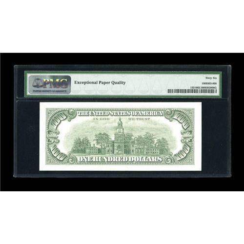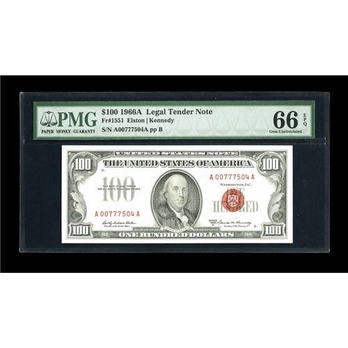 <B>Fr. 1551 $100 1966A Legal Tender Note. PMG Gem Uncirculated 66 EPQ.</B></I><BR>The overprints are deep on this legal from the tougher of the two series.<BR><BR><b>Shipping:</b> Coins & Currency (<a target="_blank" href="http://www.heritageauctions.com/common/shipping.php">view shipping information</a>)
