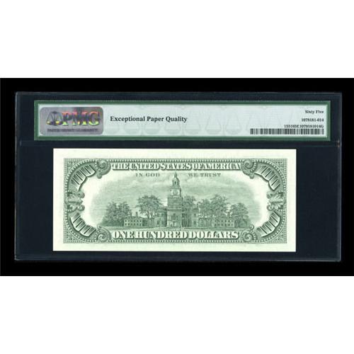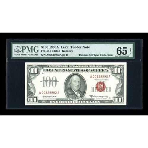 <B>Fr. 1551 $100 1966A Legal Tender Note. PMG Gem Uncirculated 65 EPQ.</B></I><BR> This is a note we used to have multiples of in most sales. Now the multiples have dwindled to the occasional uncirculated example offered in every second or third sale. Few will be nicer than this PMG Gem 65 EPQ example. <BR><I>From The Thomas M. Flynn Collection</B></I><BR><BR><b>Shipping:</b> Coins & Currency (<a target="_blank" href="http://www.heritageauctions.com/common/shipping.php">view shipping information</a>)