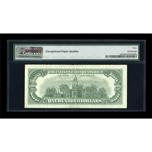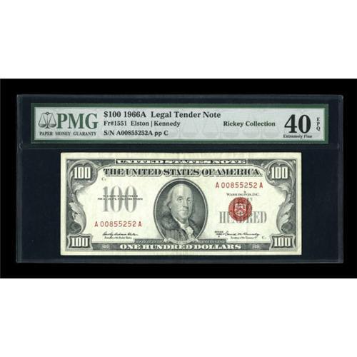 <B>Fr. 1551 $100 1966A Legal Tender Note. PMG Extremely Fine 40 EPQ.</B></I><BR> Friedberg 1551 is much scarcer than its Fr. 1550 counterpart. The tri-folded paper is bright and the inks vibrant.<BR><BR><b>Shipping:</b> Coins & Currency (<a target="_blank" href="http://www.heritageauctions.com/common/shipping.php">view shipping information</a>)