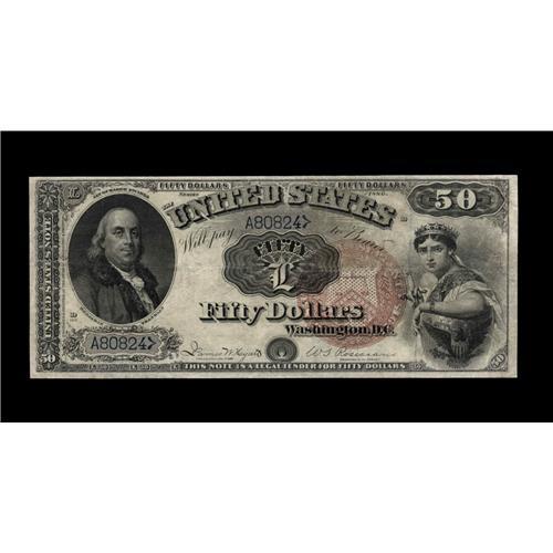 <B>Fr. 158 $50 1880 Legal Tender Very Fine.</B></I> Only eight Fr. 158s are known, one of which is permanently off the market. A small run of high grade pieces has skewed the condition Census for this number. With six of the eight known pieces grading About New or better. This note is the only affordable example of this number that will likely ever cross the market. It's a decently margined piece with a nice overall appearance in spite of several minor restorations--by far the most significant being a re-attached upper right-hand corner.