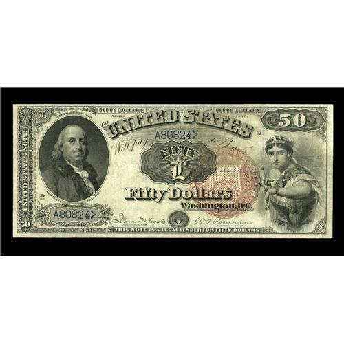 <B>Fr. 158 $50 1880 Legal Tender Very Fine.</B></I> Less than ten Fr. 158s are known, one of which is permanently impounded at the Federal Reserve Bank of Richmond and another is part of the ANA Museum. A mini-run of high-grade pieces has skewed the condition census for this Friedberg number with most of the remaining pieces grading About New or better. This note is the only affordable example of this number that will likely ever be available. It's a decently margined piece with a nice overall appearance in spite of several minor restorations--by far the most significant being a nicely re-attached upper right-hand corner. If you are not successful tonight, no telling when another opportunity will arise.<BR><BR><b>Shipping:</b> Coin/Currency (<a target="_blank" href="http://www.heritageauctions.com/common/shipping.php">view shipping information</a>)