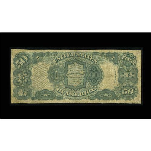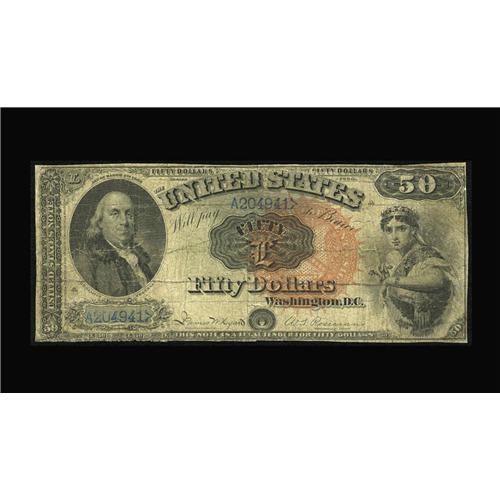 <B>Fr. 159 $50 1880 Legal Tender Very Good.</B></I> About a dozen and a half examples are known of this number, with two of them grading AU and no others better than Fine. The margins on this piece are tight all the way around, but this note, although very heavily circulated, has no other important problems. There is a sprinkling of very tiny pinholes as one would expect for the grade.