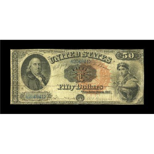 <B>Fr. 159 $50 1880 Legal Tender Very Good.</B></I> About a dozen and a half examples are known of this number, with two of them grading AU and no others better than Fine. The margins on this piece are tight all the way around, but this note, although very heavily circulated, has no other important problems. There is a sprinkling of very tiny pinholes as one would expect for the grade.<BR><I>From The Collection of Greg Southward</B></I><BR><BR><b>Shipping:</b> Coins & Currency (<a target="_blank" href="http://www.heritageauctions.com/common/shipping.php">view shipping information</a>)