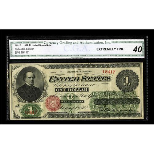 Fr. 16 $1 1862 Legal Tender CGA Extremely Fine 40. An i
