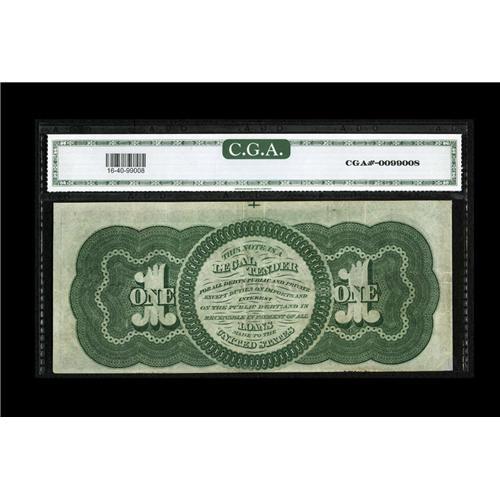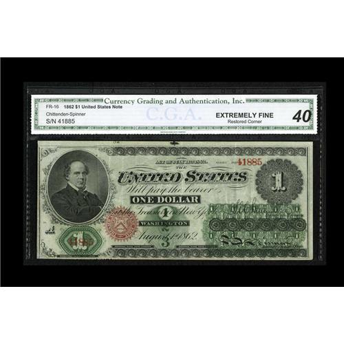 <B>Fr. 16 $1 1862 Legal Tender CGA Extremely Fine 40.</B></I> This legal Ace has been improved by a small corner restoration as noted on the holder.