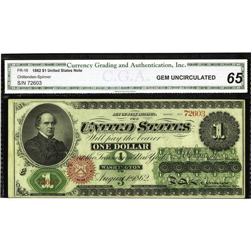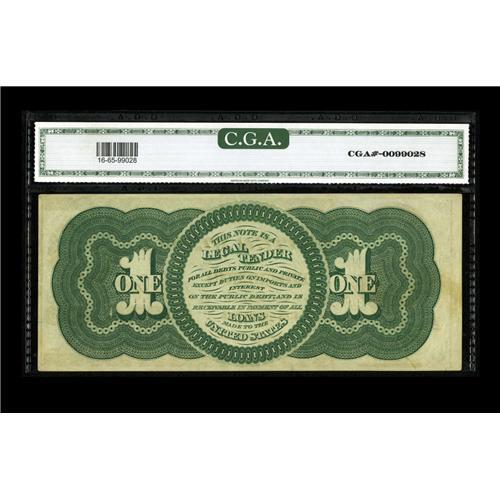 <B>Fr. 16 $1 1862 Legal Tender CGA Gem Uncirculated 65.</B></I> Nice back centering and vivid color certainly make a case for the grade assigned. A wide margin at left with all framelines visible.