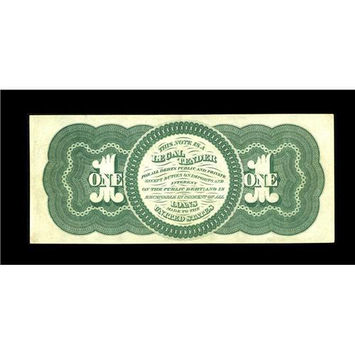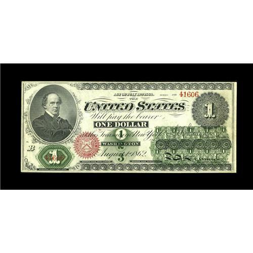<B>Fr. 16 $1 1862 Legal Tender Choice About New+.</B></I> One of those notes that just looking at it you know is Choice, but the corner tip fold into the design says otherwise. Towering embossing is seen on this wonderfully inked Ace. Certain to bring an above average price.