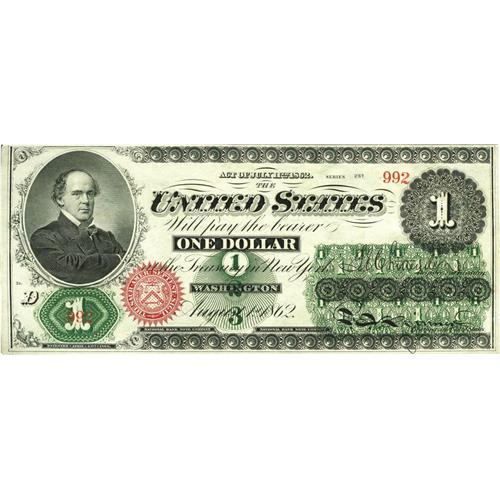 <B>Fr. 16 $1 1862 Legal Tender New.</B></I> An appealing example that might even qualify as Choice, except that the top margin is cut into the frameline. Three digit serial number 992 graces deeply inked surfaces.