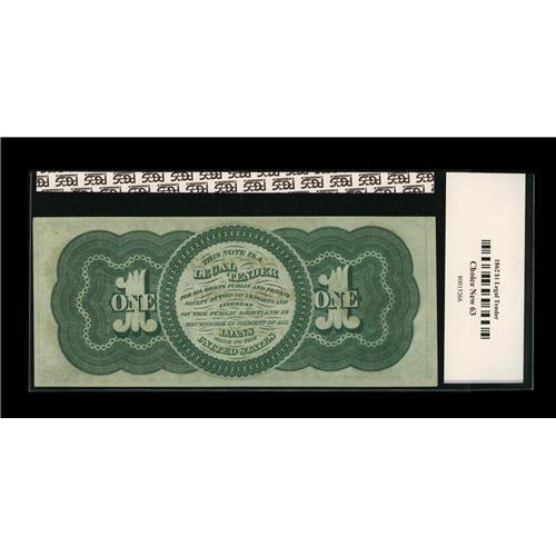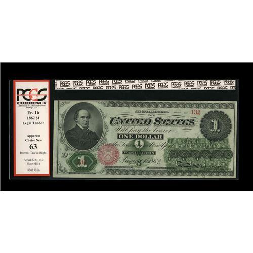 <B>Fr. 16 $1 1862 Legal Tender PCGS Apparent Choice New 63.</B></I> The red-holder comment is, "Internal Tear at Right." The tear is in the "1" counter to the right of the serial number, and it's quite difficult to see.