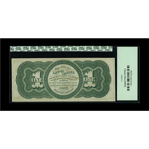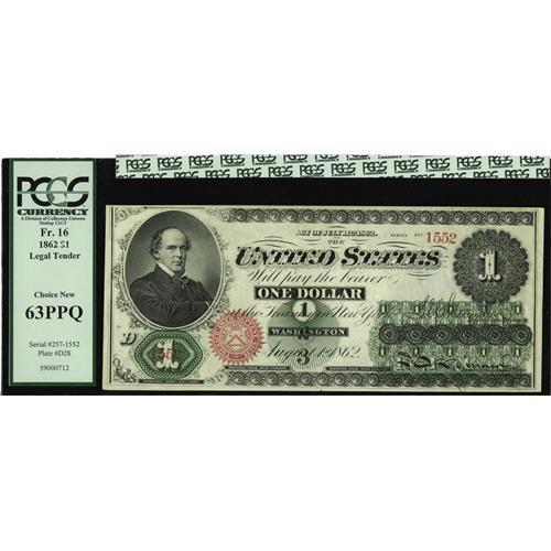 <B>Fr. 16 $1 1862 Legal Tender PCGS Choice New 63PPQ.</B></I> The front to back centering is ideal as is the color. The grade is not Gem solely for a tight margin at the upper left. Of the notes listed in the book <I>100 Greatest American Currency Notes,</B></I> this piece ranks No. 31.<BR><I>From The Troy Wiseman Collection</B></I>