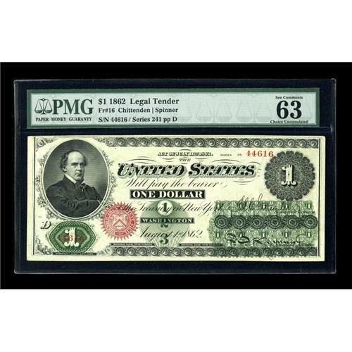 <B>Fr. 16 $1 1862 Legal Tender PMG Choice Uncirculated 63 EPQ.</B></I> A high end early Ace with terrific paper color. PMG has awarded their Exceptional Paper Quality comment.<BR><BR><b>Shipping:</b> Coins & Currency (<a target="_blank" href="http://www.heritageauctions.com/common/shipping.php">view shipping information</a>)